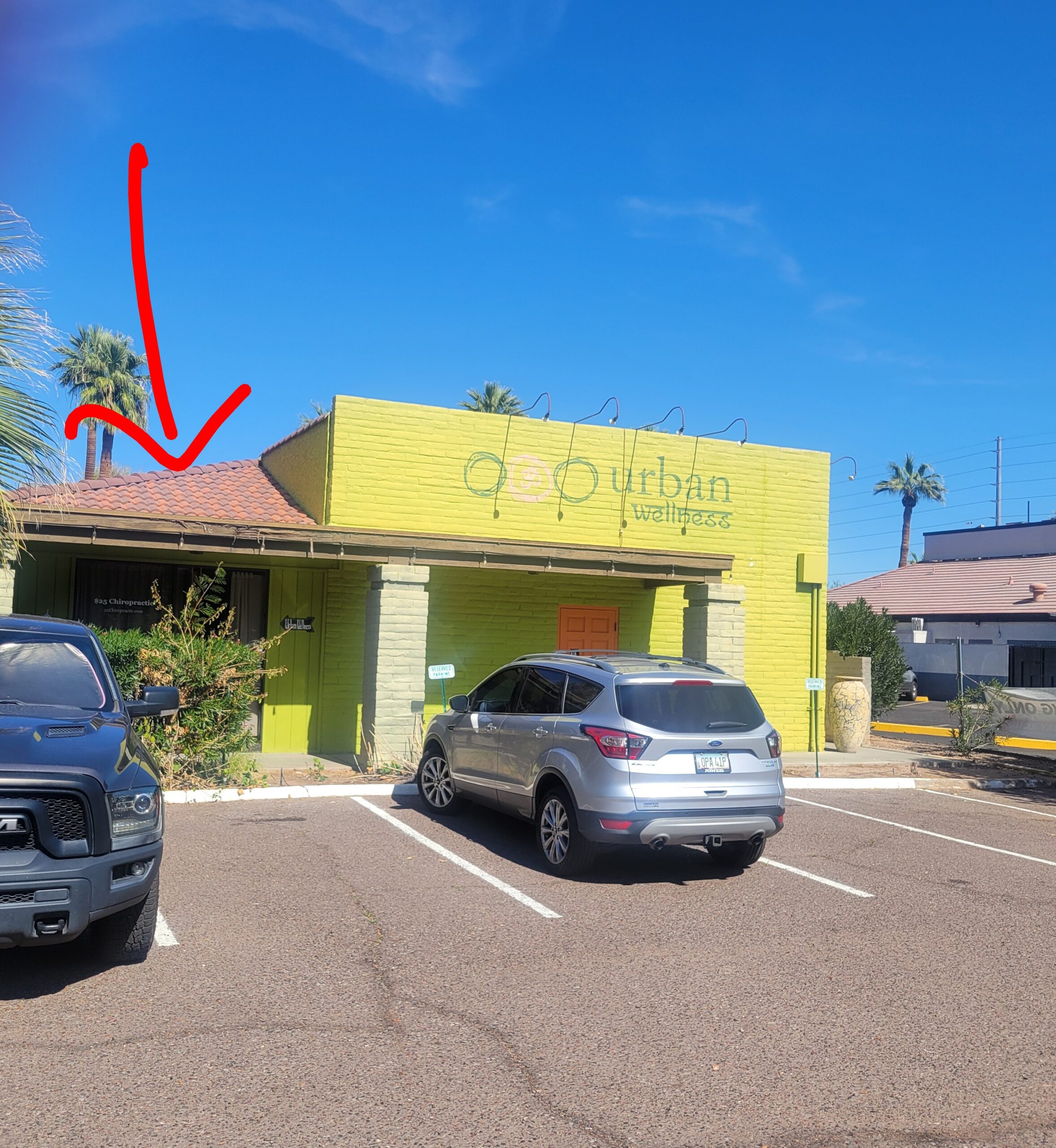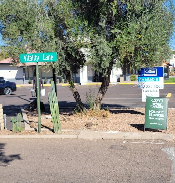 There is an imitation street sign that says “Vitality Lane” and an “Urban Wellness” sign at our entrance (which is between Marisco Boys and Presidio Cocina Mexicana – see images directly below).